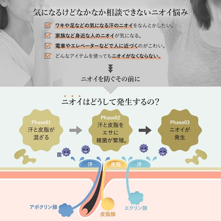 ●ニオイの元を殺菌・消毒。体臭・汗臭をしっかり防ぐ。