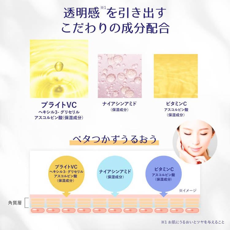 ●保湿成分:ナイアシンアミド・ビタミンC(※2)・ブライトVC(※3)配合。乾燥しがちなお肌にうるおいを与えて、透明感(※4)アップ。