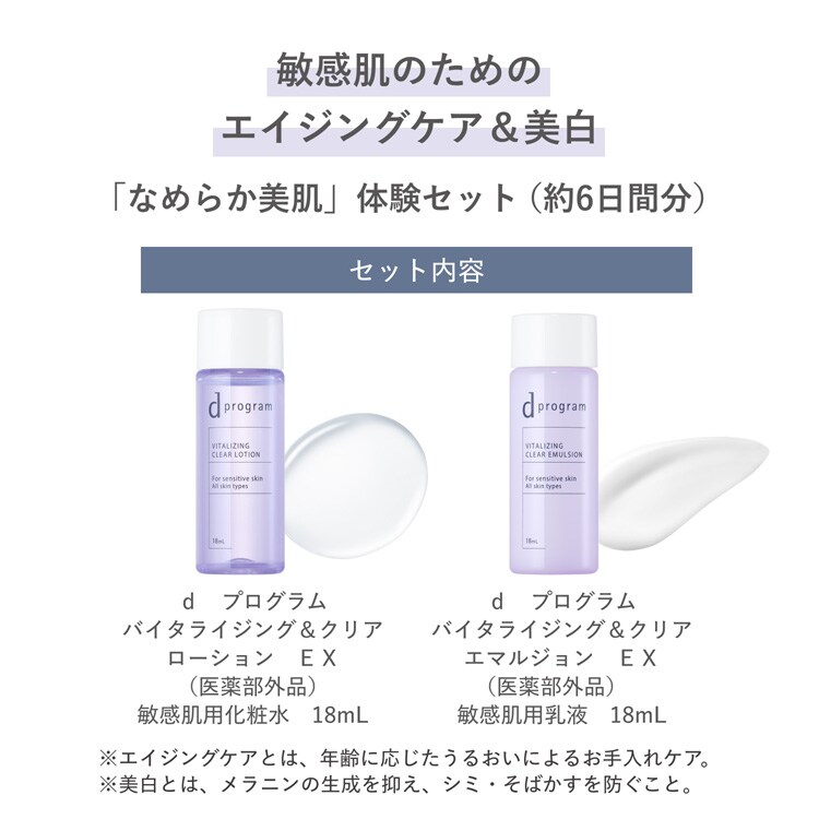 | ・d プログラム バイタライジング&クリア ローション EX (医薬部外品) 敏感肌用化粧水 18mL ・d プログラム バイタライジング&クリア エマルジョン EX (医薬部外品) 敏感肌用乳液 18mL |