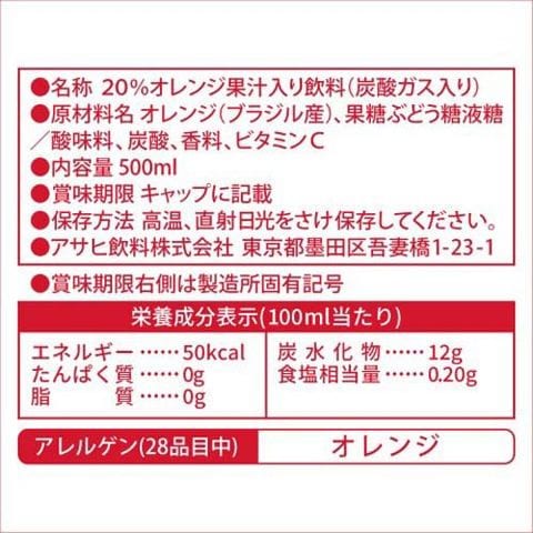 | オレンジ(ブラジル産)、果糖ぶどう糖液糖/酸味料、炭酸、香料、ビタミンC |