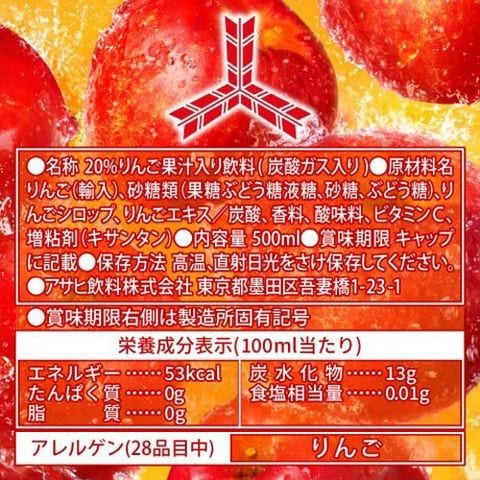 | りんご(輸入)、砂糖類(果糖ぶどう糖液糖、砂糖、ぶどう糖)、りんごシロップ、りんごエキス/炭酸、香料、酸味料、ビタミンC、増粘剤(キサンタン) |