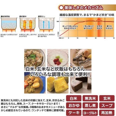 ●無洗米にも対応した白米の炊飯に加えて、玄米、炊き込みご飯はもちろん、煮物、ケーキやヨーグルトまで。多機能な炊飯器です。