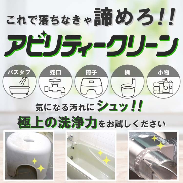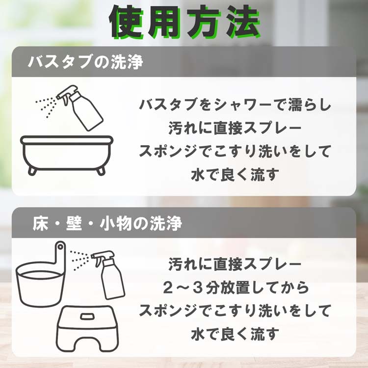 ・浴室内(床・壁・洗面器・イス等)の洗浄:汚れに直接スプレーしスポンジ等で軽くこすり洗いした後、水ですすいでください。汚れがひどい時は、2~3分放置するとより効果的です。