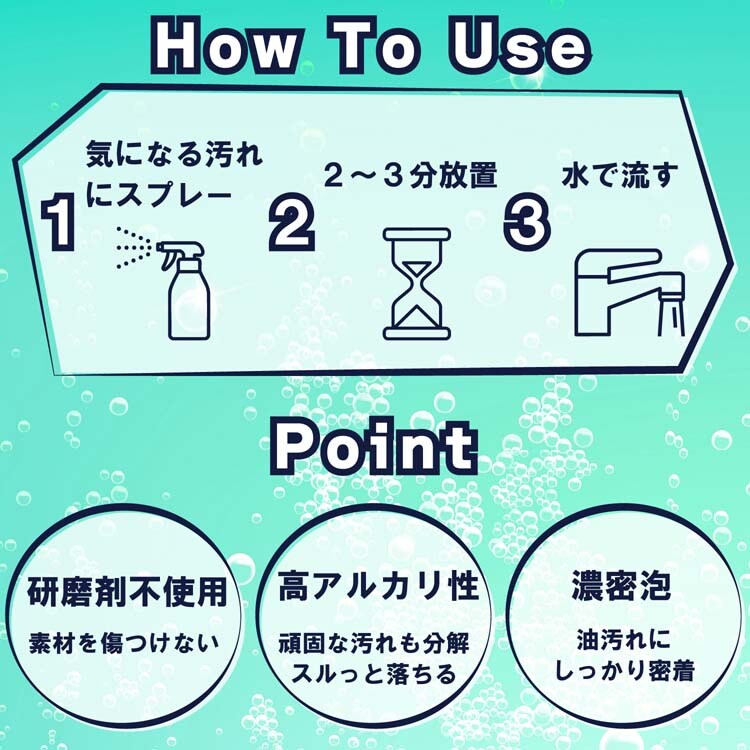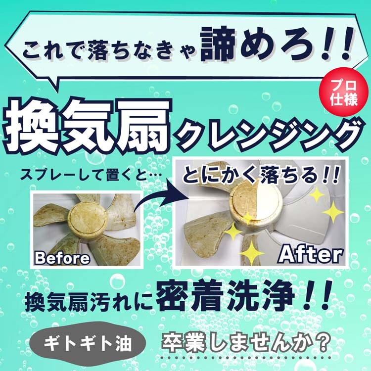 ●換気扇専用洗剤。シュッとスプレーで泡が油に密着、簡単洗浄!