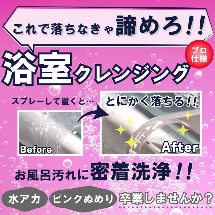 ●浴槽の洗浄や浴室内の洗浄(床・壁・洗面用具・風呂フタ・シャワーカーテン・排水口周り・浴室鏡等)にぴったりな洗剤