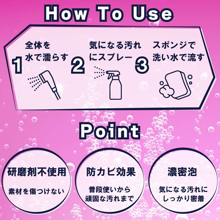 ●シャワー等で全体を濡らしてから、汚れに直接スプレーしスポンジ等で擦り洗いをした後、水ですすいでください。●汚れがひどい時は、2~3分放置後擦り洗いをしてください。※一部の浴槽、床、壁では変色やツヤがなくなることがありますので、目立たない場所で確かめてからご使用ください。5分以上(長時間)放置しないでください。