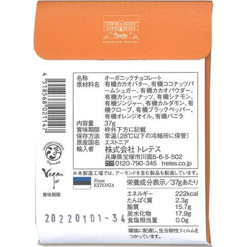 | 有機カカオバター、有機ココナッツパームシュガー、有機カカオパウダー、有機カシューナッツ、有機シナモン、有機ジンジャー、有機カルダモン、有機クローブ、有機ブラックペッパー、有機オレンジオイル、有機バニラ |