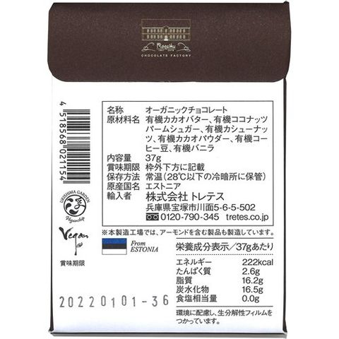 | 有機カカオバター、有機ココナッツパームシュガー、有機カシューナッツ、有機カカオパウダー、有機コーヒー、有機バニラ |