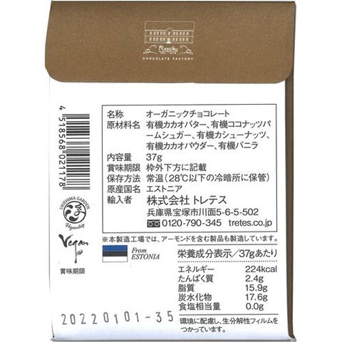 | 有機カカオバター、有機ココナッツパームシュガー、有機カシューナッツ、有機カカオパウダー、有機バニラ |
