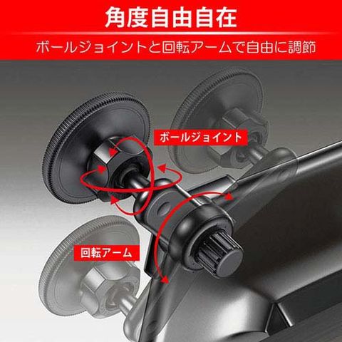 ●自由自在な角度調整:アーム部分に搭載されたボールジョイントにより、スマホの角度を自由自在に調整可能。