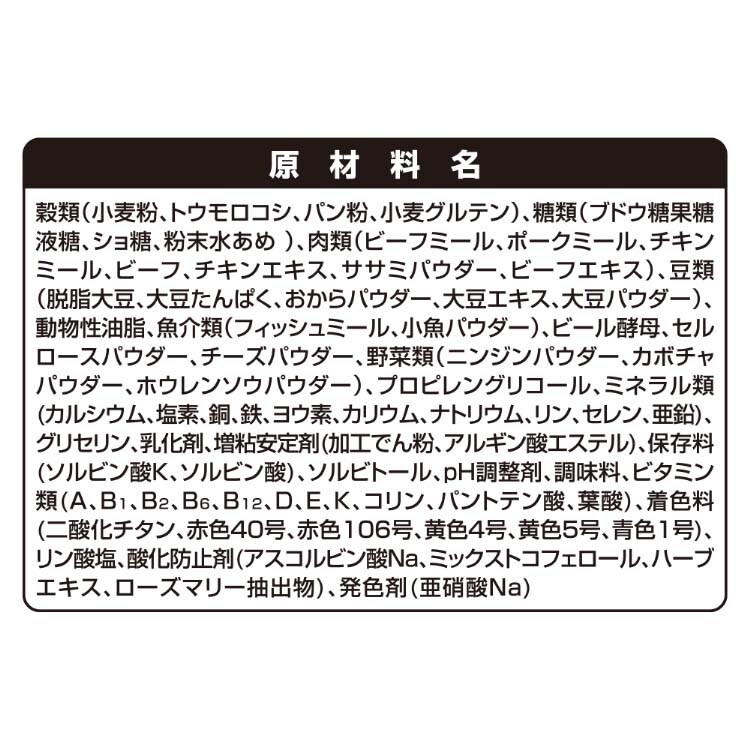 | 穀類(小麦粉、トウモロコシ、パン粉、小麦グルテン)、糖類(ブドウ糖果糖液糖、ショ糖、粉末水あめ)、肉類(ビーフミール、ポークミール、チキンミール、ビーフ、チキンエキス、ササミパウダー、ビーフエキス)、豆類(脱脂大豆、大豆たんぱく、おからパウダー、大豆エキス、大豆パウダー)、動物性油脂、魚介類(フィッシュミール、小魚パウダー)、ビール酵母、セルロースパウダー、チーズパウダー、野菜類(ニンジンパウダー、カボチャパウダー、ホウレンソウパウダー)、プロピレングリコール、ミネラル類(カルシウム、塩素、銅、鉄、ヨウ素、カリウム、ナトリウム、リン、セレン、亜鉛)、グリセリン、乳化剤、増粘安定剤(加工でん粉、アルギン酸エステル)、保存料(ソルビン酸K、ソルビン酸)、ソルビトール、pH調整剤、調味料、ビタミン類(A、B1、B2、B6、B12、D、E、K、コリン、パントテン酸、葉酸)、着色料(二酸化チタン、赤色40号、赤色106号、黄色4号、黄色5号、青色1号)、リン酸塩、酸化防止剤(アスコルビン酸Na、ミックストコフェロール、ハーブエキス、ローズマリー抽出物)、発色剤(亜硝酸Na) |