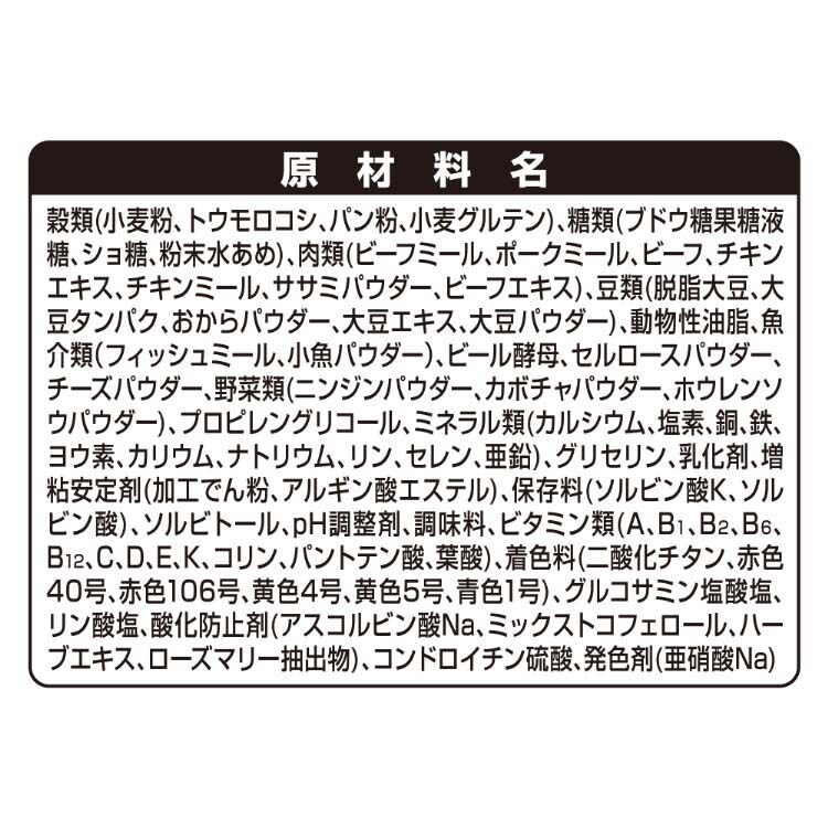 | 穀類(小麦粉、トウモロコシ、パン粉、小麦グルテン)、糖類(ブドウ糖果糖液糖、ショ糖、粉末水あめ)、肉類(ビーフミール、ポークミール、ビーフ、チキンエキス、チキンミール、ササミパウダー、ビーフエキス)、豆類(脱脂大豆、大豆タンパク、おからパウダー、大豆エキス、大豆パウダー)、動物性油脂、魚介類(フィッシュミール、小魚パウダー)、ビール酵母、セルロースパウダー、チーズパウダー、野菜類(ニンジンパウダー、カボチャパウダー、ホウレンソウパウダー)、プロピレングリコール、ミネラル類(カルシウム、塩素、銅、鉄、ヨウ素、カリウム、ナトリウム、リン、セレン、亜鉛)、グリセリン、乳化剤、増粘安定剤(加工でん粉、アルギン酸エステル)、保存料(ソルビン酸K、ソルビン酸)、ソルビトール、pH調整剤、調味料、ビタミン類(A、B1、B2、B6、B12、C、D、E、K、コリン、パントテン酸、葉酸)、着色料(二酸化チタン、赤色40号、赤色106号、黄色4号、黄色5号、青色1号)、グルコサミン塩酸塩、リン酸塩、酸化防止剤(アスコルビン酸Na、ミックストコフェロール、ハーブエキス、ローズマリー抽出物)、コンドロイチン硫酸、発色剤(亜硝酸Na) |