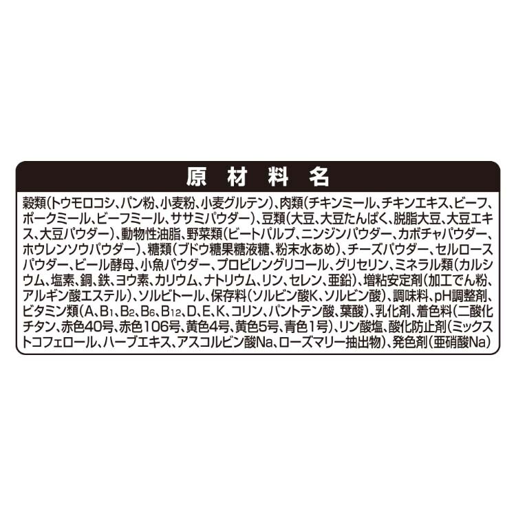 穀類(トウモロコシ、パン粉、小麦粉、小麦グルテン)、肉類(チキンミール、チキンエキス、ビーフ、ポークミール、ビーフミール、ササミパウダー)、豆類(大豆、大豆たんぱく、脱脂大豆、大豆エキス、大豆パウダー)、動物性油脂、野菜類(ビートパルプ、ニンジンパウダー、カボチャパウダー、ホウレンソウパウダー)、糖類(ブドウ糖果糖液糖、粉末水あめ)、チーズパウダー、セルロースパウダー、ビール酵母、小魚パウダー、プロピレングリコール、グリセリン、ミネラル類(カルシウム、塩素、銅、鉄、ヨウ素、カリウム、ナトリウム、リン、セレン、亜鉛)、増粘安定剤(加工でん粉、アルギン酸エステル)、ソルビトール、保存料(ソルビン酸K、ソルビン酸)、調味料、pH調整剤、ビタミン類(A、B1、B2、B6、B12、D、E、K、コリン、パントテン酸、葉酸)、乳化剤、着色料(二酸化チタン、赤色40号、赤色106号、黄色4号、黄色5号、青色1号)、リン酸塩、酸化防止剤(ミックストコフェロール、ハーブエキス、アスコルビン酸Na、ローズマリー抽出物)、発色剤(亜硝酸Na)