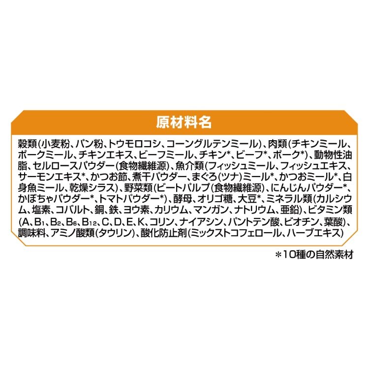 | 穀類(小麦粉、パン粉、トウモロコシ、コーングルテンミール)、肉類(チキンミール、ポークミール、チキンエキス、ビーフミール、チキン※、ビーフ※、ポーク※)、動物性油脂、セルロースパウダー(食物繊維源)、 魚介類(フィッシュミール、フィッシュエキス、サーモンエキス※、かつお節、煮干パウダー、まぐろ(ツナ)ミール※、かつおミール※、白身魚ミール、乾燥シラス)、野菜類(ビートパルプ(食物繊維源)、にんじんパウダー※、 かぼちゃパウダー※、トマトパウダー※)、酵母、オリゴ糖、大豆※、ミネラル類(カルシウム、塩素、コバルト、銅、鉄、ヨウ素、カリウム、マンガン、ナトリウム、亜鉛)、ビタミン類(A、B1、B2、B6、B12、C、D、E、K、コリン、 ナイアシン、パントテン酸、ビオチン、葉酸)、調味料、アミノ酸類(タウリン)、酸化防止剤(ミックストコフェロール、ハーブエキス)※10種の自然素材 |