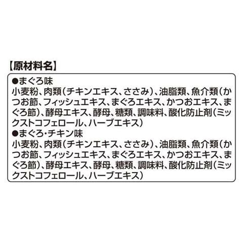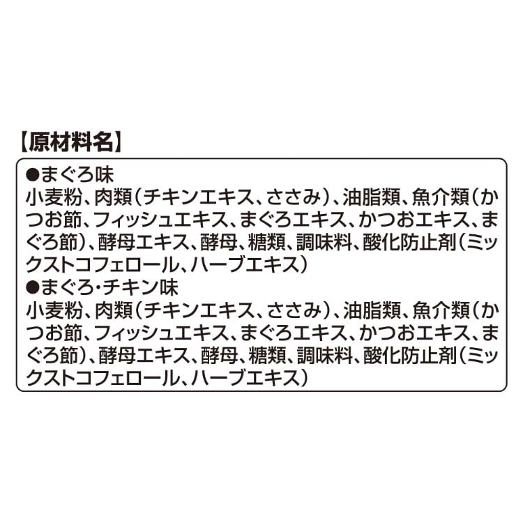 | ★まぐろ味 小麦粉、肉類(チキンエキス、ささみ)、油脂類、魚介類(かつお節、フィッシュエキス、まぐろエキス、かつおエキス、まぐろ節)、酵母エキス、酵母、糖類、調味料、酸化防止剤(ミックストコフェロール、ハーブエキス) ★まぐろ・チキン味 小麦粉、肉類(チキンエキス、ささみ)、油脂類、魚介類(かつお節、フィッシュエキス、まぐろエキス、かつおエキス、まぐろ節)、酵母エキス、酵母、糖類、調味料、酸化防止剤(ミックストコフェロール、ハーブエキス) |
