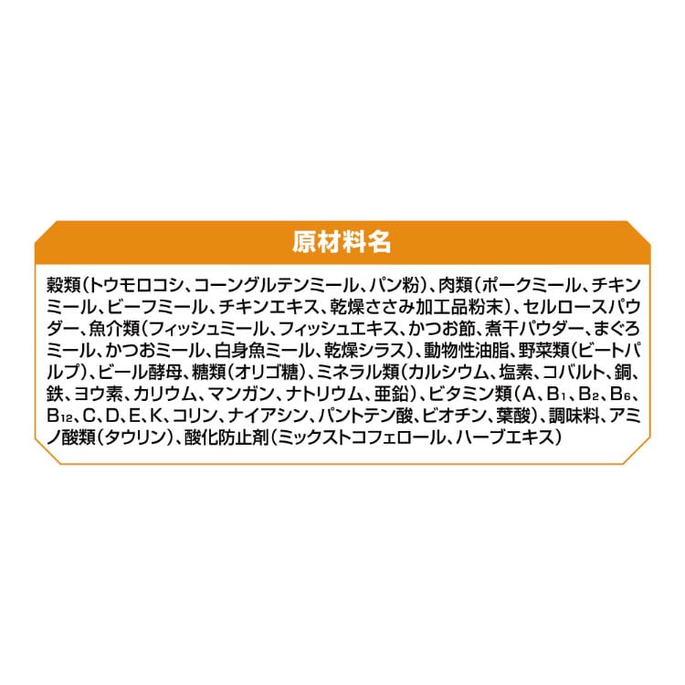 | 穀類(トウモロコシ、コーングルテンミール、パン粉)、肉類(ポークミール、チキンミール、ビーフミール、チキンエキス、乾燥ささみ加工品粉末)、セルロースパウダー、魚介類(フィッシュミール、フィッシュエキス、かつお節、煮干パウダー、まぐろミール、かつおミール、白身魚ミール、乾燥シラス)、動物性油脂、野菜類(ビートパルプ)、ビール酵母、糖類(オリゴ糖)、ミネラル類(カルシウム、塩素、コバルト、銅、鉄、ヨウ素、カリウム、マンガン、ナトリウム、亜鉛)、ビタミン類(A、B1、B2、B6、B12、C、D、E、K、コリン、ナイアシン、パントテン酸、ビオチン、葉酸)、調味料、アミノ酸類(タウリン)、酸化防止剤(ミックストコフェロール、ハーブエキス) |