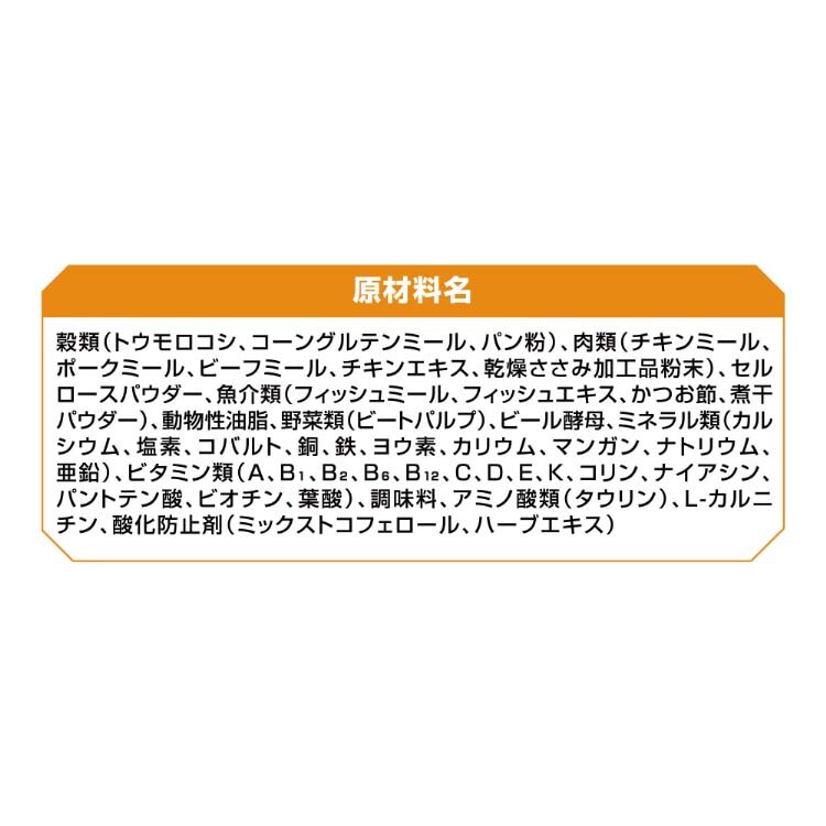 | 穀類(トウモロコシ、コーングルテンミール、パン粉)、肉類(チキンミール、ポークミール、ビーフミール、チキンエキス、乾燥ささみ加工品粉末)、セルロースパウダー、魚介類(フィッシュミール、フィッシュエキス、かつお節、煮干パウダー)、動物性油脂、野菜類(ビートパルプ)、ビール酵母、ミネラル類(カルシウム、塩素、コバルト、銅、鉄、ヨウ素、カリウム、マンガン、ナトリウム、亜鉛)、ビタミン類(A、B1、B2、B6、B12、C、D、E、K、コリン、ナイアシン、パントテン酸、ビオチン、葉酸)、調味料、アミノ酸類(タウリン)、L-カルニチン、酸化防止剤(ミックストコフェロール、ハーブエキス) |