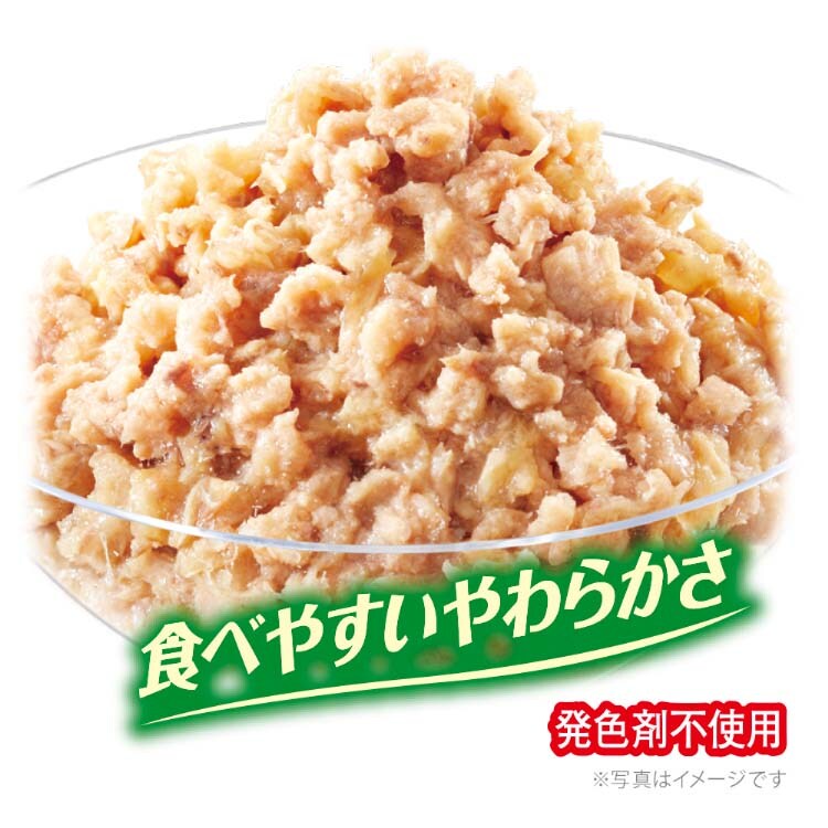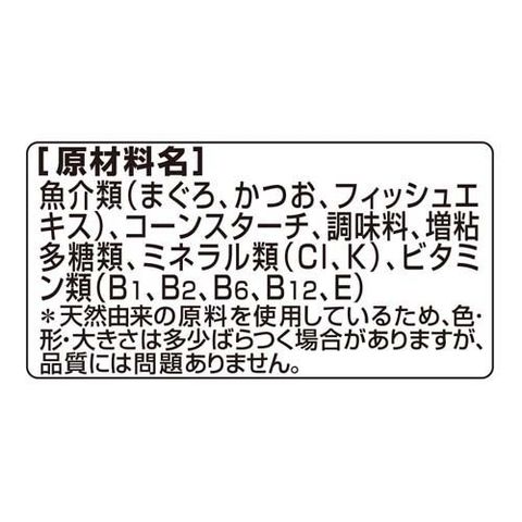 | 魚介類(まぐろ、かつお、フィッシュエキス)、コーンスターチ、調味料、増粘多糖類、ミネラル類(Cl、K)、ビタミン類(B1、B2、B6、B12、E) |