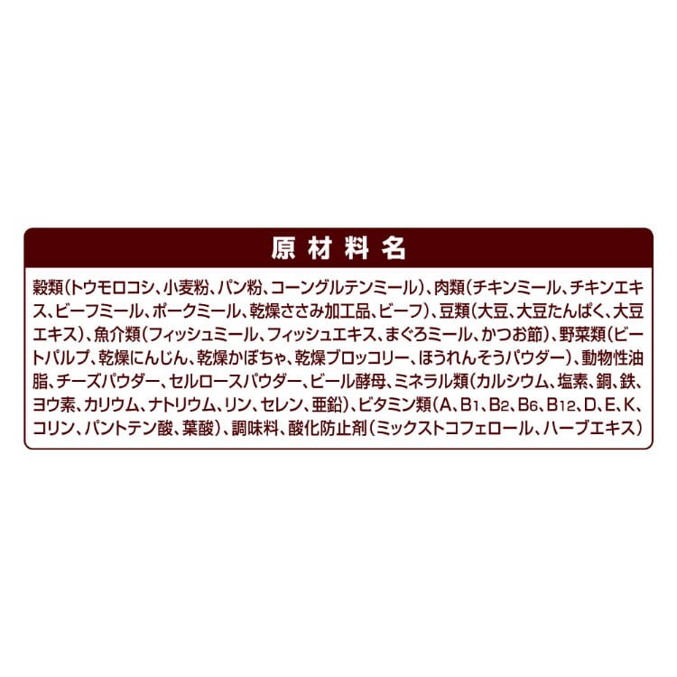 | 穀類(トウモロコシ、小麦粉、パン粉、コーングルテンミール)、肉類(チキンミール、チキンエキス、ビーフミール、ポークミール、乾燥ささみ加工品、ビーフ)、豆類(大豆、大豆たんぱく、大豆エキス)、魚介類(フィッシュミール、フィッシュエキス、まぐろミール、かつお節)、野菜類(ビートパルプ、乾燥にんじん、乾燥かぼちゃ、乾燥ブロッコリー、ほうれんそうパウダー)、動物性油脂、チーズパウダー、セルロースパウダー、ビール酵母、ミネラル類(カルシウム、塩素、銅、鉄、ヨウ素、カリウム、ナトリウム、リン、セレン、亜鉛)、ビタミン類(A、B1、B2、B6、B12、D、E、K、コリン、パントテン酸、葉酸)、調味料、酸化防止剤(ミックストコフェロール、ハーブエキス) |