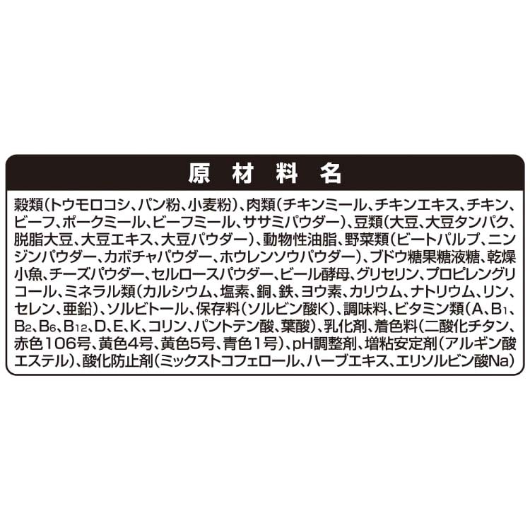 | 穀類(トウモロコシ、パン粉、小麦粉)、肉類(チキンミール、チキンエキス、チキン、ビーフ、ポークミール、ビーフミール、ササミパウダー)、豆類(大豆、大豆タンパク、脱脂大豆、大豆エキス、大豆パウダー)、動物性油脂、野菜類(ビートパルプ、ニンジンパウダー、カボチャパウダー、ホウレンソウパウダー)、ブドウ糖果糖液糖、乾燥小魚、チーズパウダー、セルロースパウダー、ビール酵母、グリセリン、プロピレングリコール、ミネラル類(カルシウム、塩素、銅、鉄、ヨウ素、カリウム、ナトリウム、リン、セレン、亜鉛)、ソルビトール、保存料(ソルビン酸K)、調味料、ビタミン類(A、B1、B2、B6、B12、D、E、K、コリン、パントテン酸、葉酸)、乳化剤、着色料(二酸化チタン、赤色106号、黄色4号、黄色5号、青色1号)、pH調整剤、増粘安定剤(アルギン酸エステル)、酸化防止剤(ミックストコフェロール、ハーブエキス、エリソルビン酸Na) |