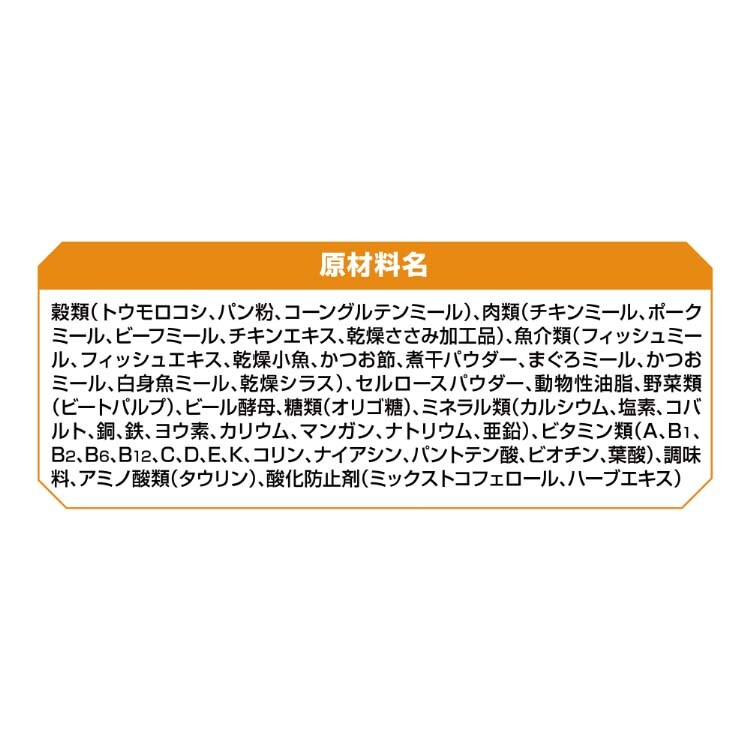 | 穀類(トウモロコシ、パン粉、コーングルテンミール)、肉類(チキンミール、ポークミール、ビーフミール、チキンエキス、乾燥ささみ加工品)、魚介類(フィッシュミール、フィッシュエキス、乾燥小魚、かつお節、煮干パウダー、まぐろミール、かつおミール、白身魚ミール、乾燥シラス)、セルロースパウダー、動物性油脂、野菜類(ビートパルプ)、ビール酵母、糖類(オリゴ糖)、ミネラル類(カルシウム、塩素、コバルト、銅、鉄、ヨウ素、カリウム、マンガン、ナトリウム、亜鉛)、ビタミン類(A、B1、B2、B6、B12、C、D、E、K、コリン、ナイアシン、パントテン酸、ビオチン、葉酸)、調味料、アミノ酸類(タウリン)、酸化防止剤(ミックストコフェロール、ハーブエキス) |