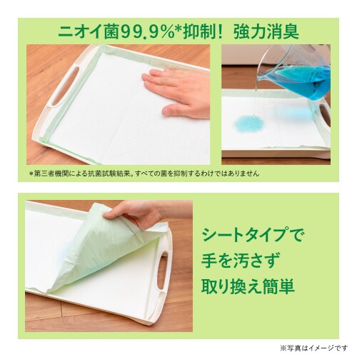 ・「複数ねこ用 消臭・抗菌シート」を取り替える際には大量の尿を吸収したシートが重たくなっている場合や、吸収した尿がこぼれる場合がありますので、シートの四隅をそっと持って新聞紙等の汚れてもかまわない上で行ってください。