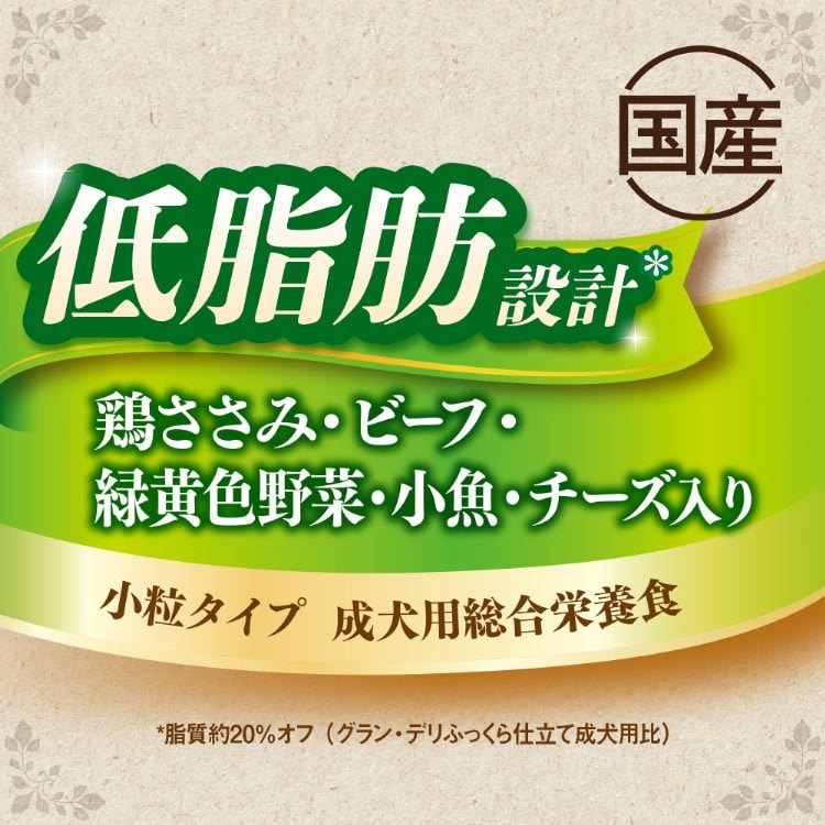 ●美味しさはそのままに、脂質を約20%オフした低脂肪タイプ(グラン・デリふっくら仕立て成犬用比)