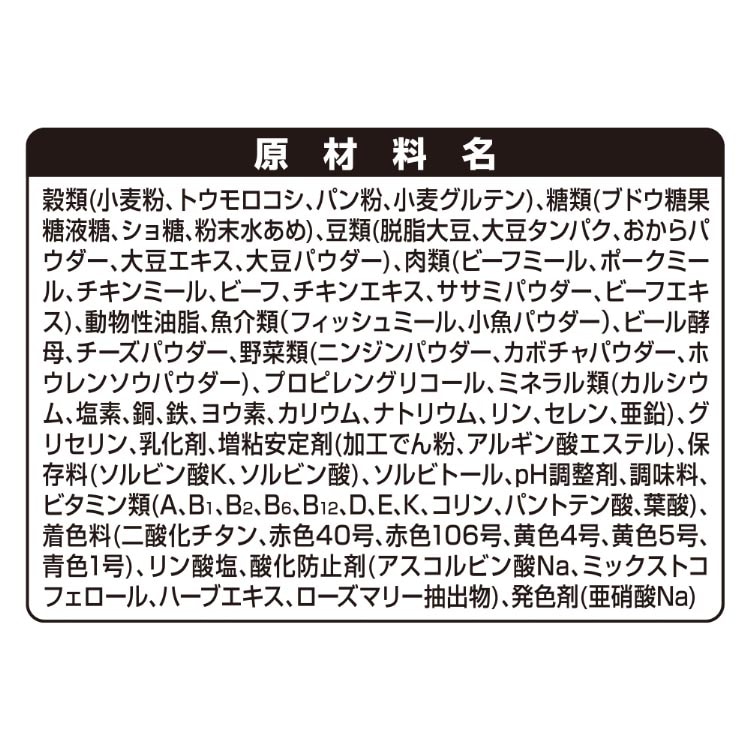 穀類(小麦粉、トウモロコシ、パン粉、小麦グルテン)、糖類(ブドウ糖果糖液糖、ショ糖、粉末水あめ)、豆類(脱脂大豆、大豆タンパク、おからパウダー、大豆エキス、大豆パウダー)、肉類(ビーフミール、ポークミール、チキンミール、ビーフ、チキンエキス、ササミパウダー、ビーフエキス)、動物性油脂、魚介類(フィッシュミール、小魚パウダー)、ビール酵母、チーズパウダー、野菜類(ニンジンパウダー、カボチャパウダー、ホウレンソウパウダー)、プロピレングリコール、ミネラル類(カルシウム、塩素、銅、鉄、ヨウ素、カリウム、ナトリウム、リン、セレン、亜鉛)、グリセリン、乳化剤、増粘安定剤(加工でん粉、アルギン酸エステル)、保存料(ソルビン酸K、ソルビン酸)、ソルビトール、pH調整剤、調味料、ビタミン類(A、B1、B2、B6、B12、D、E、K、コリン、パントテン酸、葉酸)、着色料(二酸化チタン、赤色40号、赤色106号、黄色4号、黄色5号、青色1号)、リン酸塩、酸化防止剤(アスコルビン酸Na、ミックストコフェロール、ハーブエキス、ローズマリー抽出物)、発色剤(亜硝酸Na)