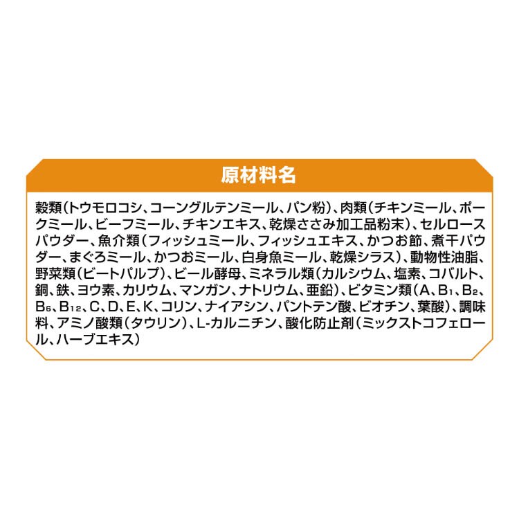 | 穀類(トウモロコシ、コーングルテンミール、パン粉)、肉類(チキンミール、ポークミール、ビーフミール、チキンエキス、乾燥ささみ加工品粉末)、セルロースパウダー、魚介類(フィッシュミール、フィッシュエキス、かつお節、煮干パウダー、まぐろミール、かつおミール、白身魚ミール、乾燥シラス)、動物性油脂、野菜類(ビートパルプ)、ビール酵母、ミネラル類(カルシウム、塩素、コバルト、銅、鉄、ヨウ素、カリウム、マンガン、ナトリウム、亜鉛)、ビタミン類(A、B1、B2、B6、B12、C、D、E、K、コリン、ナイアシン、パントテン酸、ビオチン、葉酸)、調味料、アミノ酸類(タウリン)、L-カルニチン、酸化防止剤(ミックストコフェロール、ハーブエキス) |