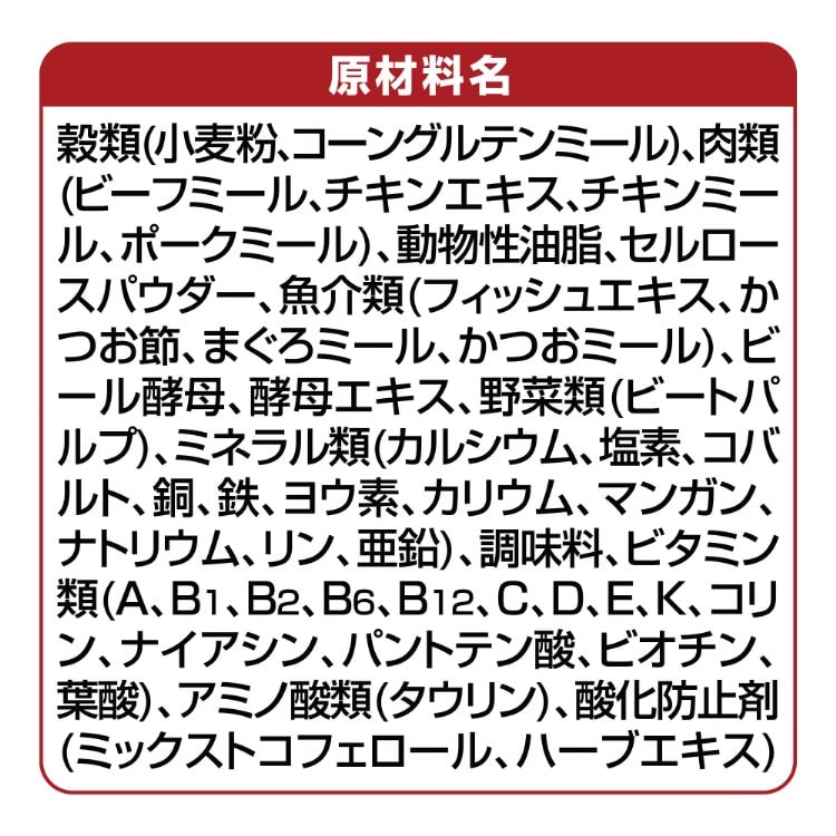 | 穀類(小麦粉、コーングルテンミール)、肉類(ビーフミール、チキンエキス、チキンミール、ポークミール)、動物性油脂、セルロースパウダー、魚介類(フィッシュエキス、かつお節、まぐろミール、かつおミール)、ビール酵母、酵母エキス、野菜類(ビートパルプ)、ミネラル類(カルシウム、塩素、コバルト、銅、鉄、ヨウ素、カリウム、マンガン、ナトリウム、リン、亜鉛)、調味料、ビタミン類(A、B1、B2、B6、B12、C、D、E、K、コリン、ナイアシン、パントテン酸、ビオチン、葉酸)、アミノ酸類(タウリン)、酸化防止剤(ミックストコフェロール、ハーブエキス) |