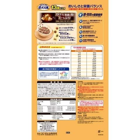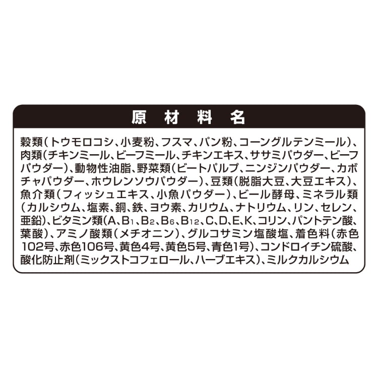 | 穀類(トウモロコシ、小麦粉、フスマ、パン粉、コーングルテンミール)、肉類(チキンミール、ビーフミール、チキンエキス、ササミパウダー、ビーフパウダー)、動物性油脂、野菜類(ビートパルプ、ニンジンパウダー、カボチャパウダー、ホウレンソウパウダー)、豆類(脱脂大豆、大豆エキス)、魚介類(フィッシュエキス、小魚パウダー)、ビール酵母、ミネラル類(カルシウム、塩素、銅、鉄、ヨウ素、カリウム、ナトリウム、リン、セレン、亜鉛)、ビタミン類(A、B1、B2、B6、B12、C、D、E、K、コリン、パントテン酸、葉酸)、アミノ酸類(メチオニン)、グルコサミン塩酸塩、着色料(赤色102号、赤色106号、黄色4号、黄色5号、青色1号)、コンドロイチン硫酸、酸化防止剤(ミックストコフェロール、ハーブエキス)、ミルクカルシウム |