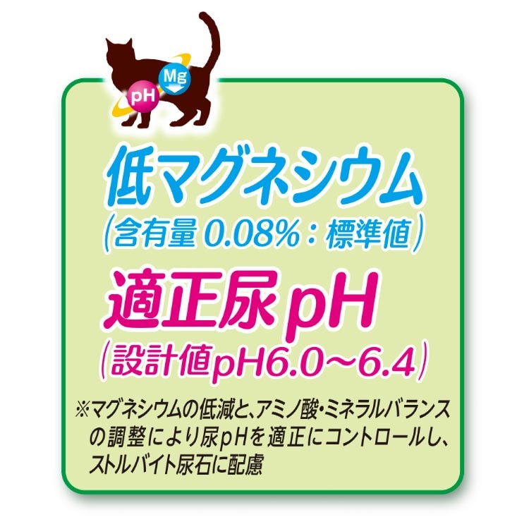 ●適正な尿pHコントロール:アミノ酸とミネラルのバランスを調整した栄養設計で、尿のpHを弱酸性(設計値pH6.0~6.4)になるようにコントロール