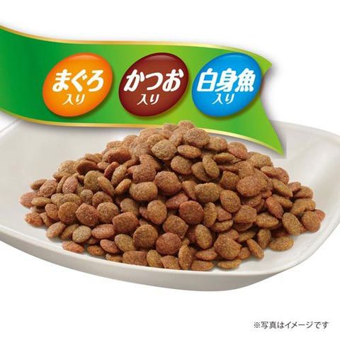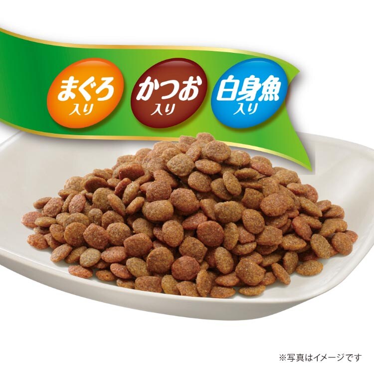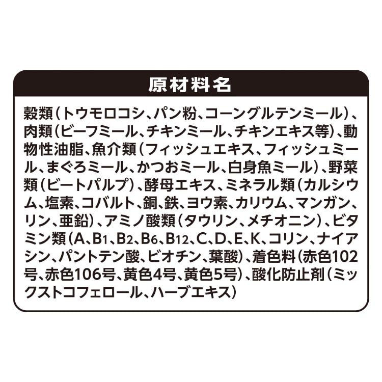 | 穀類(トウモロコシ、パン粉、コーングルテンミール)、肉類(ビーフミール、チキンミール、チキンエキス等)、動物性油脂、魚介類(フィッシュエキス、フィッシュミール、まぐろミール、かつおミール、白身魚ミール)、野菜類(ビートパルプ)、酵母エキス、ミネラル類(カルシウム、塩素、コバルト、銅、鉄、ヨウ素、カリウム、マンガン、リン、亜鉛)、アミノ酸類(タウリン、メチオニン)、ビタミン類(A、B1、B2、B6、B12、C、D、E、K、コリン、ナイアシン、パントテン酸、ビオチン、葉酸)、着色料(赤色102号、赤色106号、黄色4号、黄色5号)、酸化防止剤(ミックストコフェロール、ハーブエキス) |
