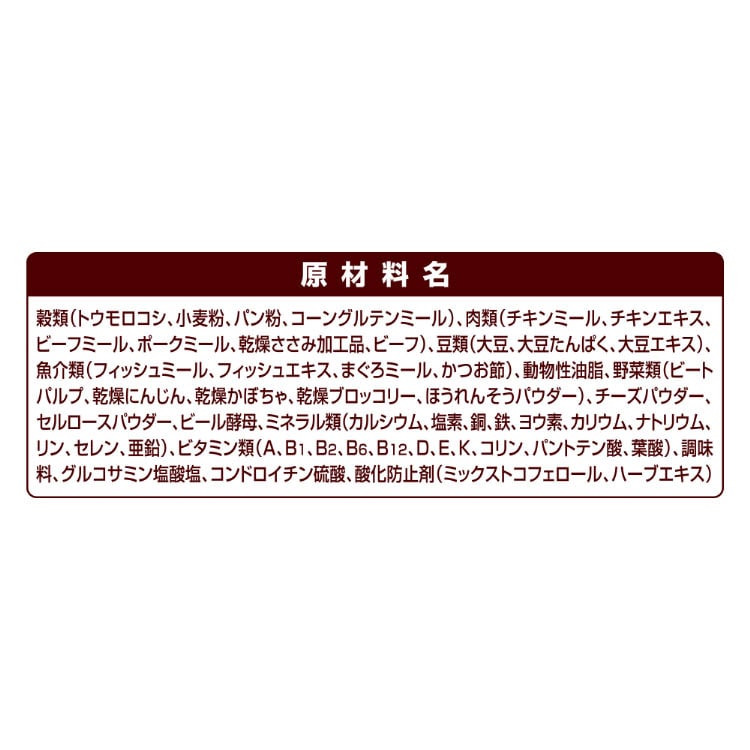 | 穀類(トウモロコシ、小麦粉、パン粉、コーングルテンミール)、肉類(チキンミール、チキンエキス、ビーフミール、ポークミール、乾燥ささみ加工品、ビーフ)、豆類(大豆、大豆たんぱく、大豆エキス)、魚介類(フィッシュミール、フィッシュエキス、まぐろミール、かつお節)、動物性油脂、野菜類(ビートパルプ、乾燥にんじん、乾燥かぼちゃ、乾燥ブロッコリー、ほうれんそうパウダー)、チーズパウダー、セルロースパウダー、ビール酵母、ミネラル類(カルシウム、塩素、銅、鉄、ヨウ素、カリウム、ナトリウム、リン、セレン、亜鉛)、ビタミン類(A、B1、B2、B6、B12、D、E、K、コリン、パントテン酸、葉酸)、調味料、グルコサミン塩酸塩、コンドロイチン硫酸、酸化防止剤(ミックストコフェロール、ハーブエキス) |