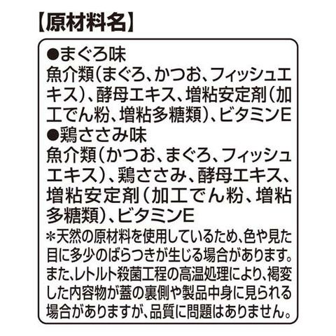| ★まぐろ味 魚介類(まぐろ、かつお、フィッシュエキス)、酵母エキス、増粘安定剤(加工でん粉、増粘多糖類)、ビタミンE ★鶏ささみ味 魚介類(かつお、まぐろ、フィッシュエキス)、鶏ささみ、酵母エキス、増粘安定剤(加工でん粉、増粘多糖類)、ビタミンE ※天然の原材料を使用しているため、色や見た目に多少のばらつきが生じる場合があります。また、レトルト殺菌工程の高温処理により、褐変した内容物が蓋の裏側や製品中身に見られる場合がありますが、品質に問題はありません。 |