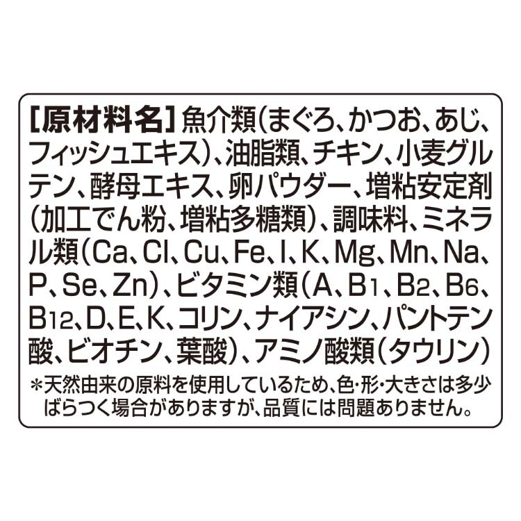 | 魚介類(まぐろ、かつお、あじ、フィッシュエキス)、油脂類、チキン、小麦グルテン、酵母エキス、卵パウダー、増粘安定剤(加工でん粉、増粘多糖類)、調味料、ミネラル類(Ca、Cl、Cu、Fe、l、K、Mg、Mn、Na、P、Se、Zn)、ビタミン類(A、B1、B2、B6、B12、D、E、K、コリン、ナイアシン、パントテン酸、ビオチン、葉酸)、アミノ酸類(タウリン) ※天然由来の原料を使用しているため、色・形・大きさは多少ばらつく場合がありますが、品質には問題ありません。 |