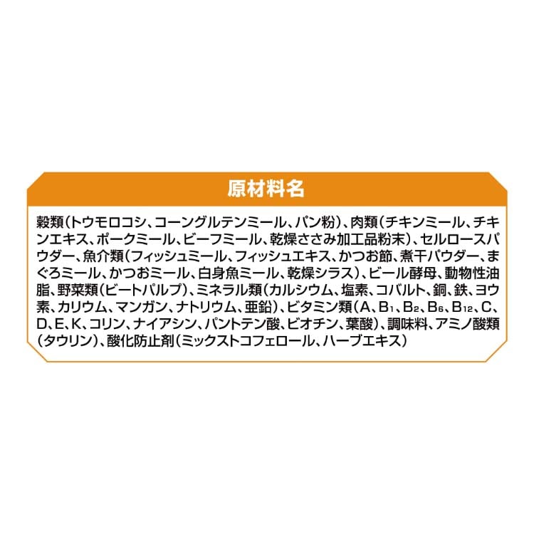 | 穀類(トウモロコシ、コーングルテンミール、パン粉)、肉類(チキンミール、チキンエキス、ポークミール、ビーフミール、乾燥ささみ加工品粉末)、セルロースパウダー、魚介類(フィッシュミール、フィッシュエキス、かつお節、煮干パウダー、まぐろミール、かつおミール、白身魚ミール、乾燥シラス)、ビール酵母、動物性油脂、野菜類(ビートパルプ)、ミネラル類(カルシウム、塩素、コバルト、銅、鉄、ヨウ素、カリウム、マンガン、ナトリウム、亜鉛)、ビタミン類(A、B1、B2、B6、B12、C、D、E、K、コリン、ナイアシン、パントテン酸、ビオチン、葉酸)、調味料、アミノ酸類(タウリン)、酸化防止剤(ミックストコフェロール、ハーブエキス) |