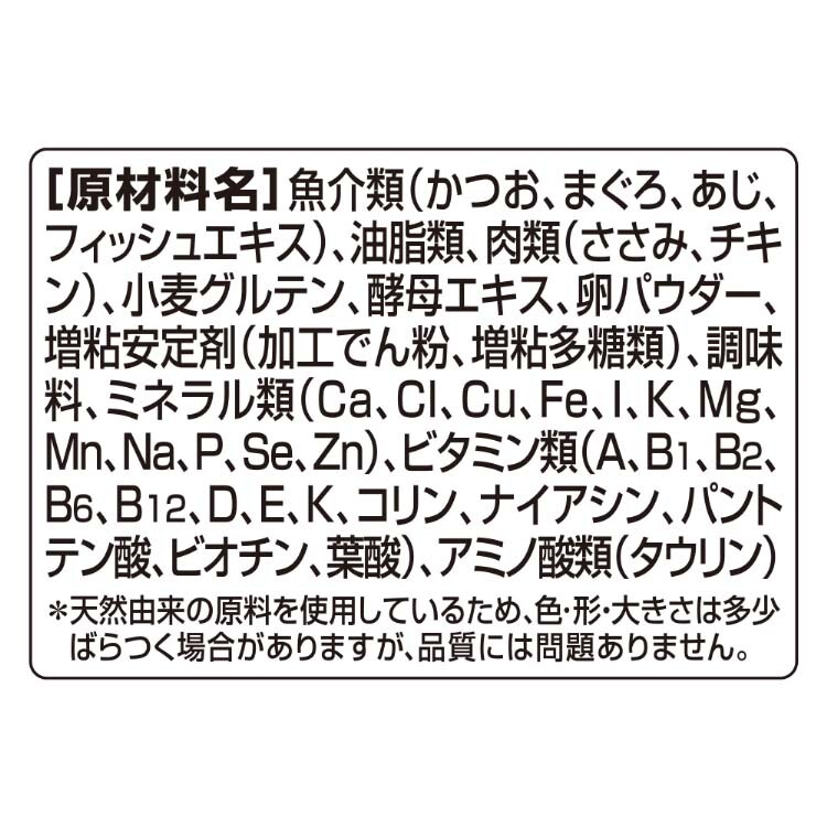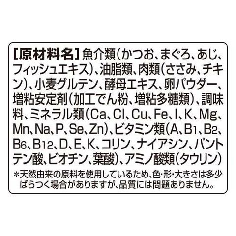 | 魚介類(かつお、まぐろ、あじ、フィッシュエキス)、油脂類、肉類(ささみ、チキン)、小麦グルテン、酵母エキス、卵パウダー、増粘安定剤(加工でん粉、増粘多糖類)、調味料、ミネラル類(Ca、Cl、Cu、Fe、l、K、Mg、Mn、Na、P、Se、Zn)、ビタミン類(A、B1、B2、B6、B12、D、E、K、コリン、ナイアシン、パントテン酸、ビオチン、葉酸)、アミノ酸類(タウリン) ※天然由来の原料を使用しているため、色・形・大きさは多少ばらつく場合がありますが、品質には問題ありません。 |