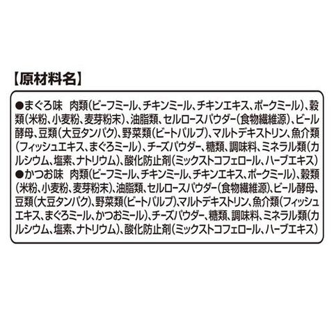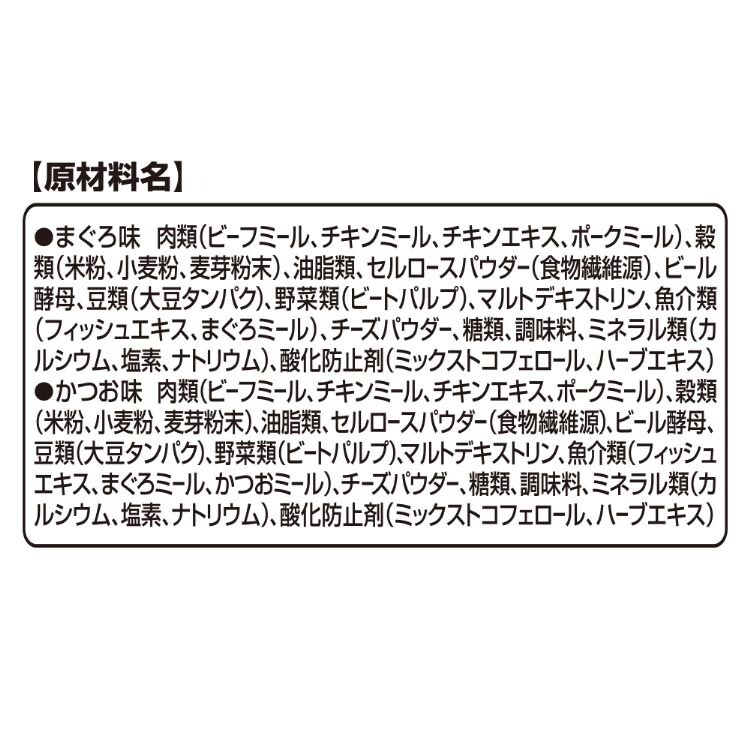 | ・まぐろ味:肉類(ビーフミール、チキンミール、チキンエキス、ポークミール)、穀類(米粉、小麦粉、麦芽粉末)、油脂類、セルロースパウダー(食物繊維源)、ビール酵母、豆類(大豆タンパク)、野菜類(ビートパルプ)、マルトデキストリン、 魚介類(フィッシュエキス、まぐろミール)、チーズパウダー、糖類、調味料、ミネラル類(カルシウム、塩素、ナトリウム)、酸化防止剤(ミックストコフェロール、ハーブエキス) ・かつお味:肉類(ビーフミール、チキンミール、チキンエキス、ポークミール)、穀類(米粉、小麦粉、麦芽粉末)、油脂類、セルロースパウダー(食物繊維源)、ビール酵母、豆類(大豆タンパク)、野菜類(ビートパルプ)、マルトデキストリン、 魚介類(フィッシュエキス、まぐろミール、かつおミール)、チーズパウダー、糖類、調味料、ミネラル類(カルシウム、塩素、ナトリウム)、酸化防止剤(ミックストコフェロール、ハーブエキス) |