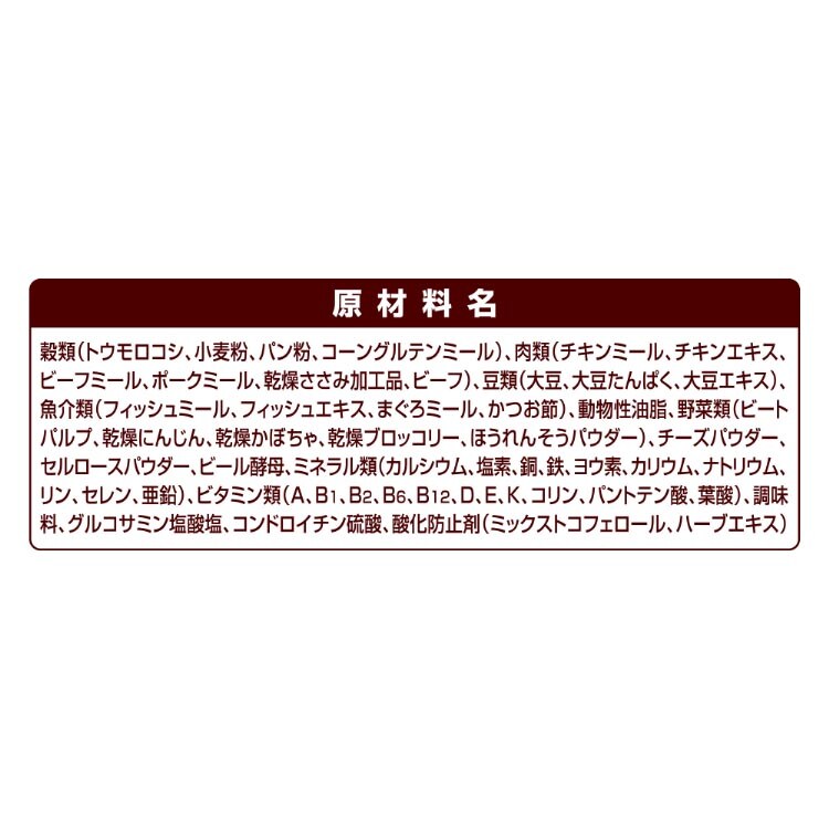 | 穀類(トウモロコシ、小麦粉、パン粉、コーングルテンミール)、肉類(チキンミール、チキンエキス、ビーフミール、ポークミール、乾燥ささみ加工品、ビーフ)、豆類(大豆、大豆たんぱく、大豆エキス)、 魚介類(フィッシュミール、フィッシュエキス、まぐろミール、かつお節)、動物性油脂、野菜類(ビートパルプ、乾燥にんじん、乾燥かぼちゃ、乾燥ブロッコリー、ほうれんそうパウダー)、チーズパウダー、セルロースパウダー、ビール酵母、 ミネラル類(カルシウム、塩素、銅、鉄、ヨウ素、カリウム、ナトリウム、リン、セレン、亜鉛)、ビタミン類(A、B1、B2、B6、B12、D、E、K、コリン、パントテン酸、葉酸)、調味料、グルコサミン塩酸塩、コンドロイチン硫酸、 酸化防止剤(ミックストコフェロール、ハーブエキス) |
