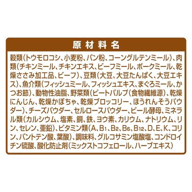 穀類(トウモロコシ、小麦粉、パン粉、コーングルテンミール)、肉類(チキンミール、チキンエキス、ビーフミール、ポークミール、乾燥ささみ加工品、ビーフ)、豆類(大豆、大豆たんぱく、大豆エキス)、魚介類(フィッシュミール、フィッシュエキス、まぐろミール、かつお節)、動物性油脂、野菜類(ビートパルプ(食物繊維源)、乾燥にんじん、乾燥かぼちゃ、乾燥ブロッコリー、ほうれんそうパウダー)、チーズパウダー、セルロースパウダー、ビール酵母、ミネラル類(カルシウム、塩素、銅、鉄、ヨウ素、カリウム、ナトリウム、リン、セレン、亜鉛)、ビタミン類(A、B1、B2、B6、B12、D、E、K、コリン、パントテン酸、葉酸)、調味料、グルコサミン塩酸塩、コンドロイチン硫酸、酸化防止剤(ミックストコフェロール、ハーブエキス)