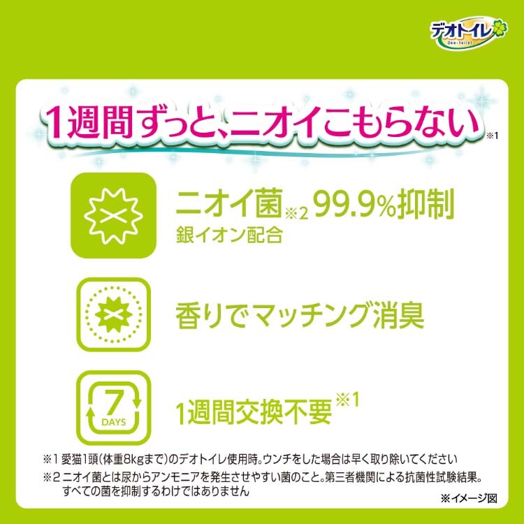 ●1週間分の尿をしっかり吸収し、抗菌剤がニオイを強力に抑えます。 ※愛猫1頭(体重8kgまで)の場合。ウンチをした場合は早く取り除いてください。