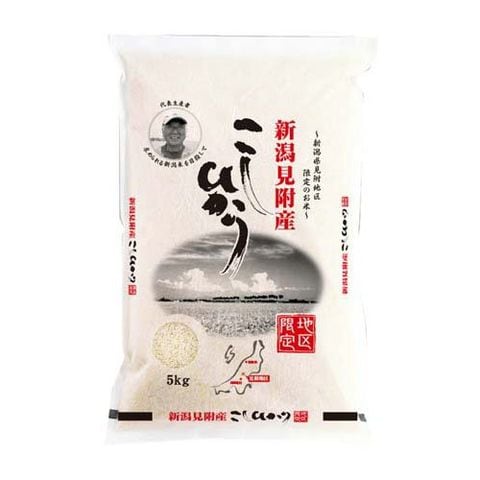 | ・産地:新潟県見附市 ・品種:コシヒカリ ・使用割合:単一原料米 ・精米年月日:反対面上部に記載 |