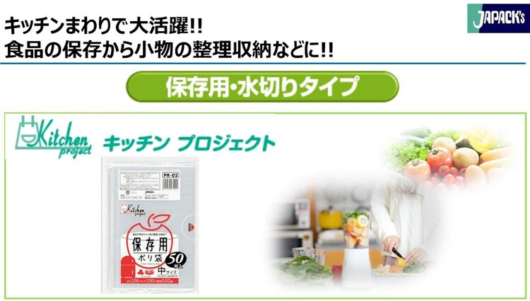 ●野菜や果物などの食品の保存や小分け、小物の整理、食品の後始末、生ごみ等の処理用のゴミ袋など、多目的に使えます。