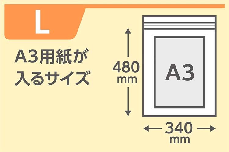 ●厚口タイプのチャック付きL規格、横340mm*縦480mm(チャック下の長さ)、厚み0.080mmのジッパー付きポリ袋です。