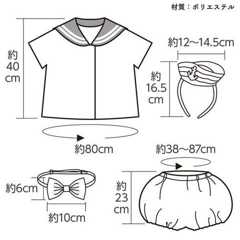 | ・1個梱包形態:ヘッダー付袋入 ・材質:ポリエステル ・商品サイズ(mm) トップス:着丈:400mm、身幅:400mm、肩幅:280mm ズボン:総丈:230mm、股下:30mm、ウエスト:380mm 蝶ネクタイ:リボン:約60×100mm、ひも:首まわり約340~420mm カチューシャ:約120×170mm |