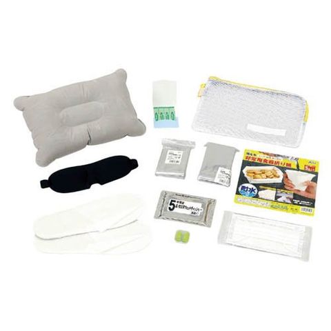 | 連絡袋×1、非常用アルミシート×1、ばんそうこう(2枚)×1、非常用食器折り紙×1、不織布マスク×1、持ち運び簡単エアー枕×1、立体スポンジアイマスク×1、耳栓×1組、非常用アルミ防寒寝袋×1、不織布スリッパ×1組、防災用ウェットティッシュ×1 |