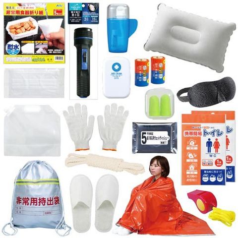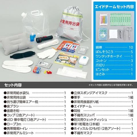 | ・セット内容 非常用持出袋*1、非常用アルミシート*1、ホイッスル(ひも付)*1、携帯簡易トイレ*2、エイドチーム*1(綿棒10本・ばんそうこう5枚・ワンタッチホータイ1枚・コットン3枚・爪切り1個・ピンセット1個・はさみ1個・ケース1個)、非常用食器折り紙*1、軍手*1組、不織布マスク*3、非常用給水袋5L*1、LED懐中電灯*1、単1乾電池(2本組)*1、持ち運び簡単エアー枕*1、立体スポンジアイマスク*1、耳栓*1組、歯ブラシ*1、歯磨き粉*1、コップ(2色アソート)*1、不織布スリッパ*1組、ロープ3m*1、防災用ウェットティッシュ*1 |