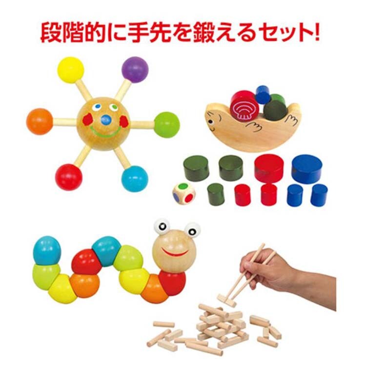 ●段階的に手先の動きを鍛えられる「手先を鍛える木製玩具セット」です。