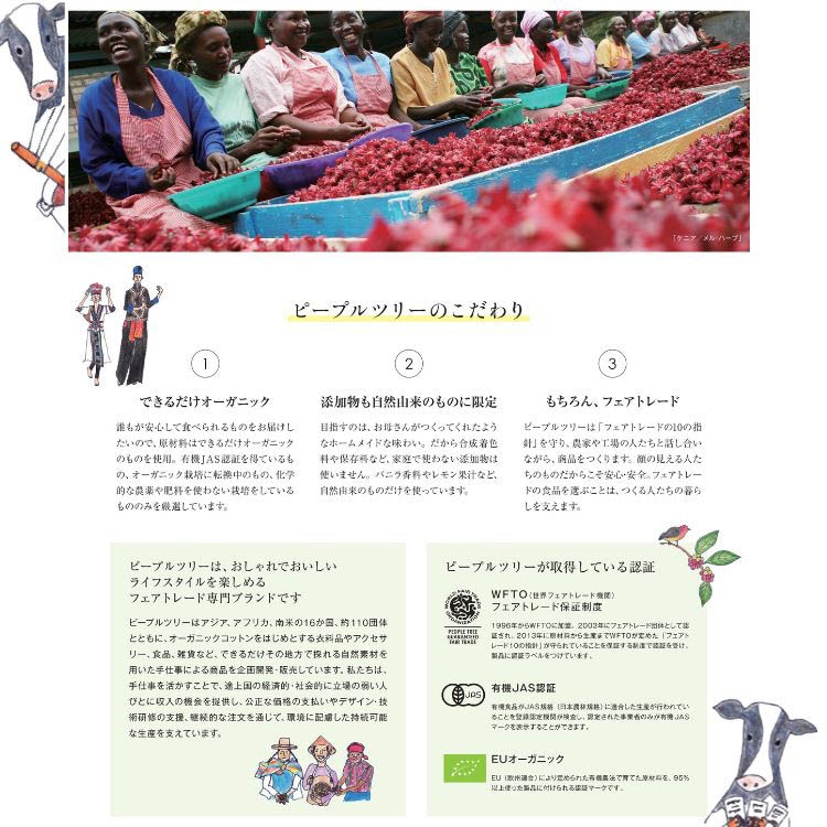 ●取得認証:WFTO(世界フェアトレード機関)、EU オーガニック(EU)、BioSuisse(スイス)